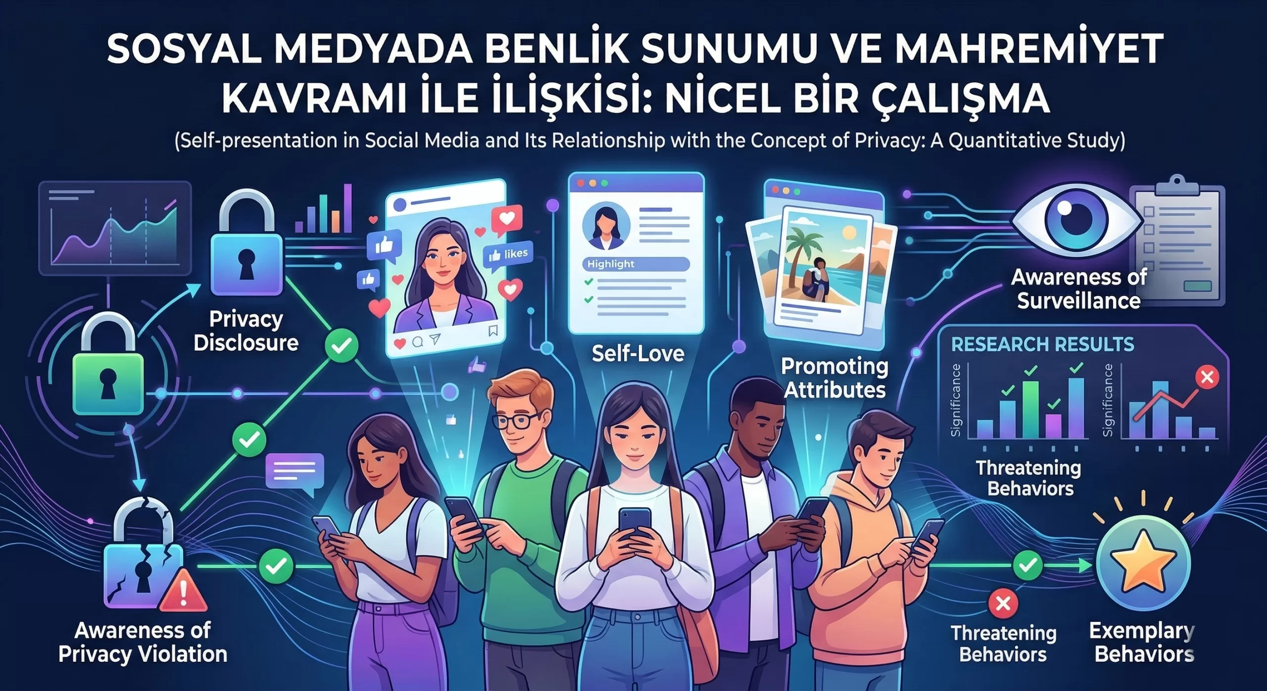 Humanity has needed communication since its existence, today; communication often takes place in digital environments. New technologies and emerging social media applications are now a part of daily life. Therefore, self-presentations made in daily life are now exhibited in the new media environment. At this point, performances on social media platforms can violate the privacy of those who perform these performances and other users. Based on these problems, this study aims to reveal how university students perform their self-presentations and to explain the relationship of this process with their perceptions of privacy. Consequently, in the study, a survey was conducted with university students aged between 18-34 to examine the relationship between the concepts of privacy and self-presentation. In the study, three different scales were applied to the participants, and the variables of disclosure of privacy, awareness of surveillance, awareness of the violation of privacy, and demonstrating exemplary behaviors were measured. As a result, It has been revealed that the variable of awareness of the violation of privacy is significant with the dimension of exhibiting exemplary behaviors, the variable of disclosure of privacy is significant with the self-love dimension and the variable of disclosure of privacy is a significant with the dimension of promoting the attributes. No significant correlations were found between the scores obtained from the sub-dimensions of the privacy scale and the scores obtained from the threatening behaviors sub-dimension. In addition, age and gender did not reveal a significant difference with the perception of privacy and self-presentation.